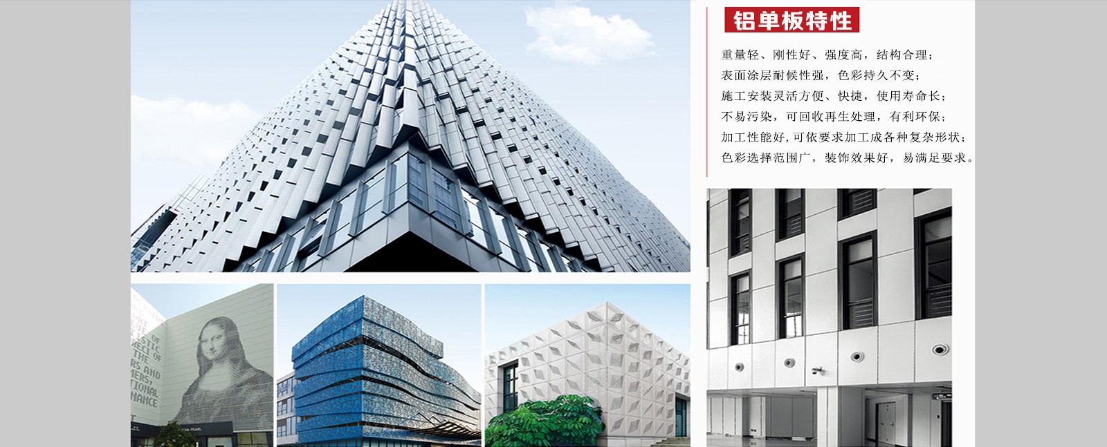 鋁單板工程案例可應用于:建筑物外墻、梁柱、門頭、陽臺、雨棚、廣告牌、室內建筑裝飾、商業大樓、別墅…